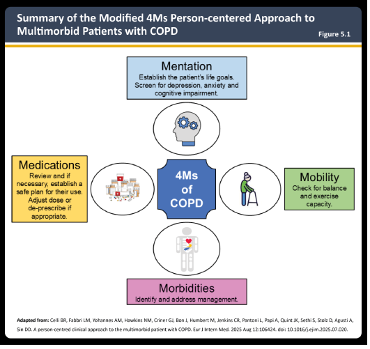For å bedre håndtere disse syndemiske effektene introduseres en personsentrert tilnærming til multimorbide kols-pasienter, en tilpasning av «4M» fra Institute for Healthcare Improvement. Den dekker de fire hjørnesteinene: Mentasjon, mobilitet, sykelighet og medisiner. Mentasjon innebærer både å definere pasientens helsemål og psykiske velvære. Mobilitet inkluderer vurdering av balanse og skrøpelighet, pluss 6-minutters gangtest, en utmerket prediktor for overlevelse ved kols. De riktige medisinene, i håndterbare mengder, for å unngå polyfarmasi. Morbiditet: det er avgjørende å identifisere alle komorbiditeter for å håndtere dem og forbedre resultatene.