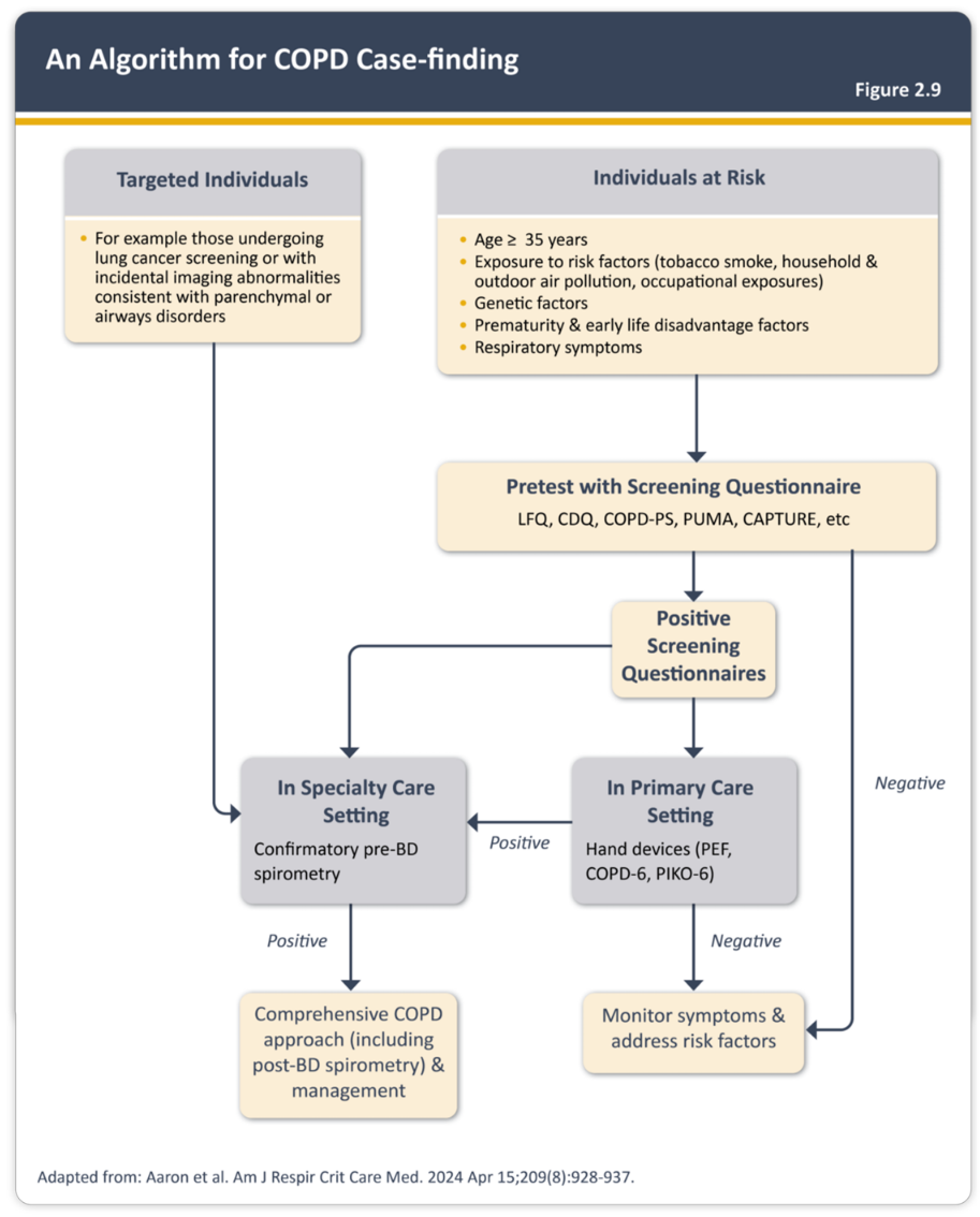 Kasusidentifisering kan gjøres enten aktivt, ved proaktivt å søke etter personer som presenterer seg med symptomer, eller opportunistisk, for eksempel ved å utføre diagnostisk spirometri blant personer som screenes for lungekreft. En ny studie som nå er referert i GOLD randomiserte personer med symptomer, men uten en astma- eller kols-diagnose, til enten å motta målrettede tiltak eller fortsette med standardbehandling. Tiltaksgruppen hadde bedre livskvalitet og helseutfall, samt lavere bruk av helsetjenester sammenlignet med de som fikk standardbehandling, noe som viser at tidlige tiltak lønner seg (2). Denne studien bidrar også til GOLDs anbefaling om aktiv identifisering av tilfeller, det vil si alltid å utføre spirometri på personer med symptomer eller risikofaktorer.