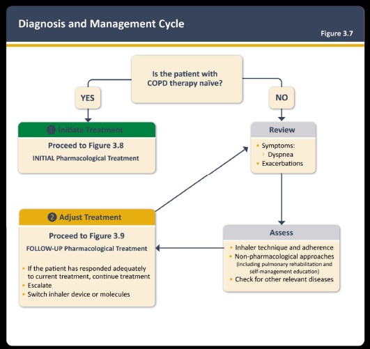 For behandlingsnaive pasienter anbefales oppstart basert på individuell vurdering av symptomer og risiko for forverring i henhold til ABE-klasse og eosinofilnivåer. For pasienter med risiko for forverring (gruppe E) der ICS er indisert, fraråder GOLD ICS+LABA siden LABA+LAMA+ICS har vist seg å være bedre for denne pasientgruppen.