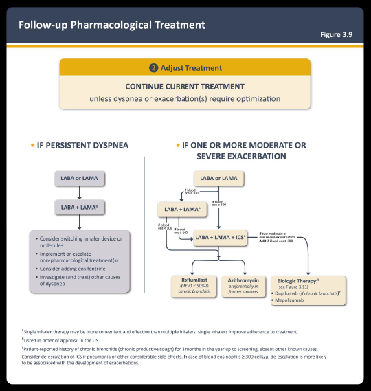 Oppfølging av pasienter er en viktig del av vellykket behandling. Prinsippet er gjennomgå-vurdere-justere. Oppfølgingsalgoritmen er basert på to behandlingsbare trekk: vedvarende dyspné og forekomst av forverring. Merk at eskalering og deeskalering av ICS følger forskjellige protokoller. En sammendragstabell over evidens for biologiske legemidler er også inkludert. Vurdering av inhalasjonsteknikk er et viktig trinn som ikke bør overses ved behandlingssvikt.
